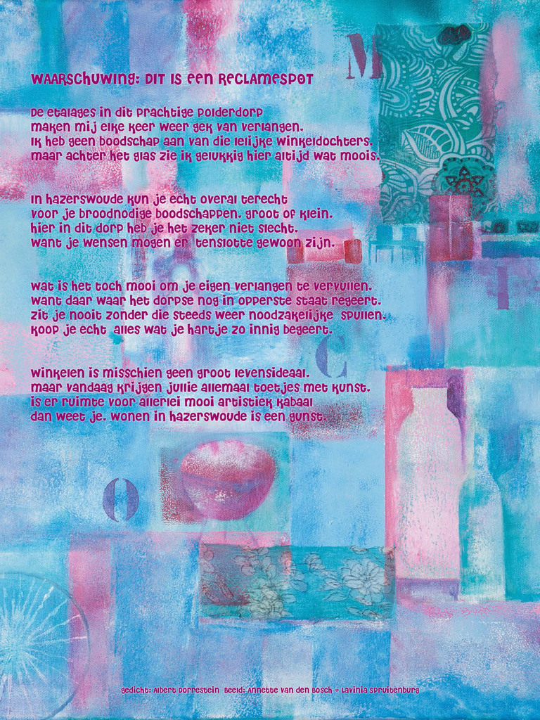 kunstposter voor het Amateur Kunst festival in Hazerswoude. Gedicht Albert Dorrestein, Fotografie Lavinia Spruitenburg. Ontwerp en uitvoering Annette vd. Bosch