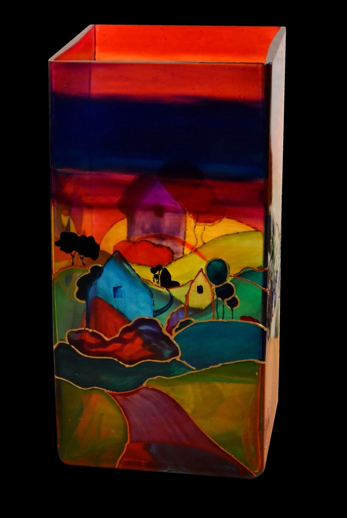 Zon Rood Oranje Geel Landschap Blauw Paars Groen Bloemen Glas Vaas Kleuren Kleurrijk Glaskunst Vierkant Bergen Bomen Roze Vrolijk Fantasie Huisjes Transparant Glazen Lichtval Heuvels