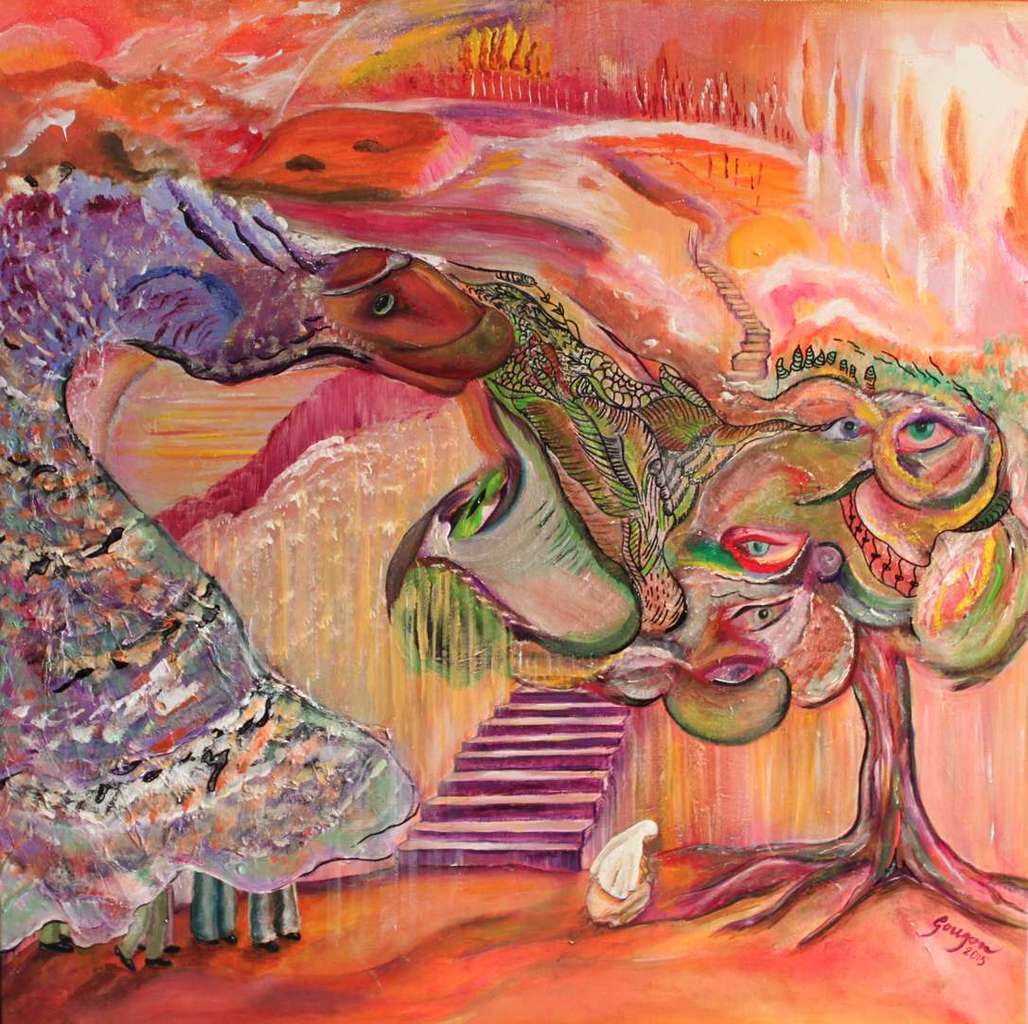 Awakening Veils Ontwaken Sluiers Oranje Bidden Vrouw Mensen Draak Vis Dragon Fish Tree Boom Eyes Ogen Spiritual