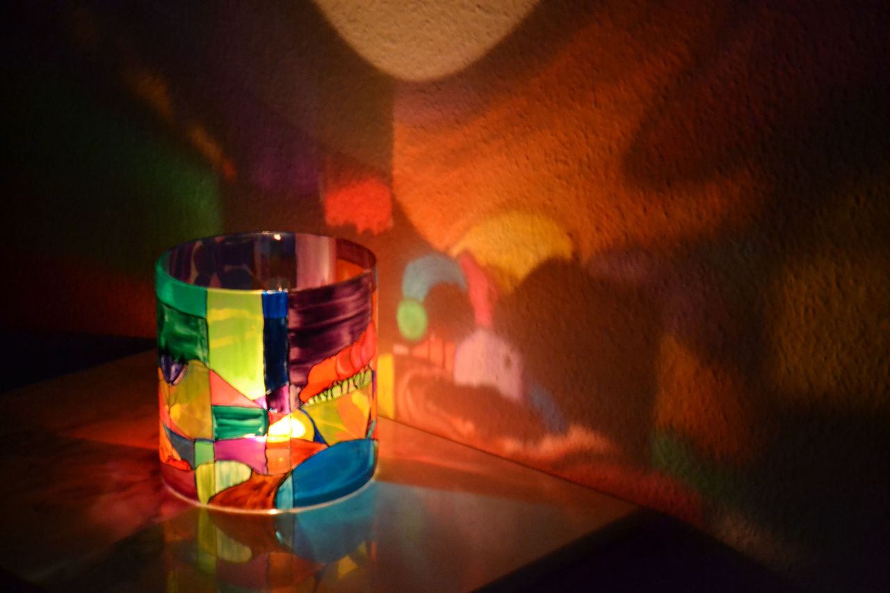 Huis Rood Oranje Geel Landschap Blauw Paars Groen Bloemen Glas Vaas Helder Art Kleurrijk Bergen Bomen Roze Vrolijk Fantasie Vlakken Kleurenspel Huisjes Transparant Glazen Kaars