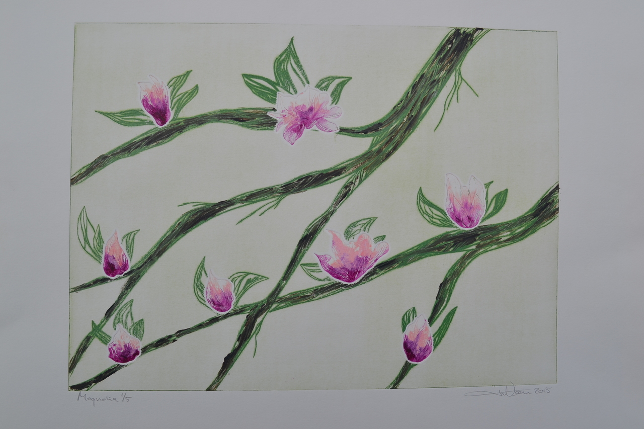 Magnolia - droge naald en aquatint - uitgezaagde zinkplaatjes - meerkleuren - oplage 1