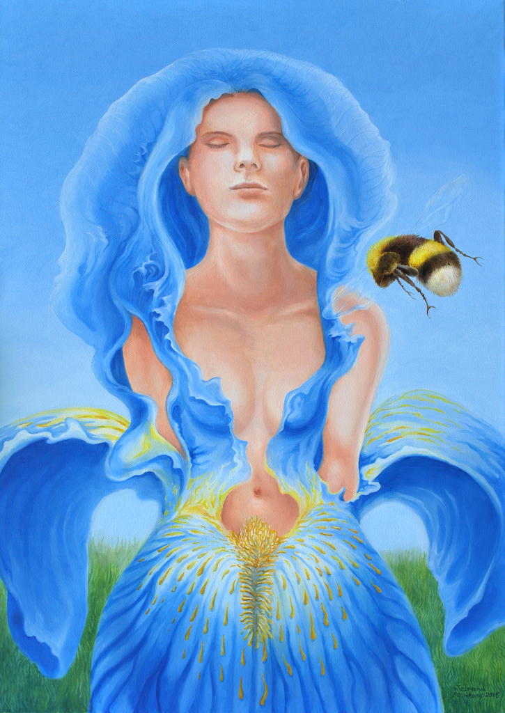 Bloemen Vrouw Iris Natuur Verlangen Bijen Hommel Bestuiving Fantasie Portret Zomer Begeerte Verleiding