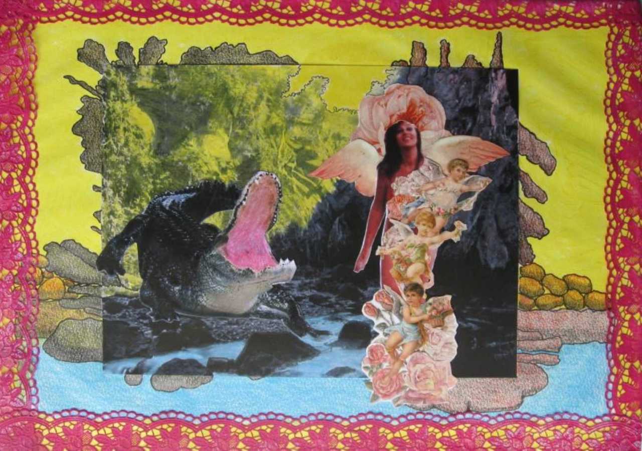 Elfen Krokodil Gevaar Surreeel Collage Humor Geel Blauw Roze
