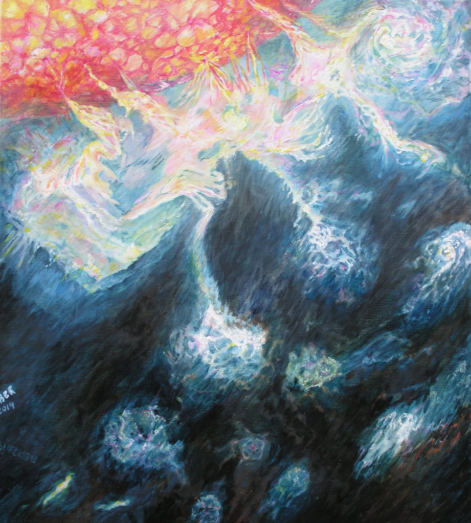 Sterren spuigen op de oceaan. De oceaan van ruimte en tijd. Het spuug drijft op de golven van de ruimte en van de tijd. Het klots, spat, borrelt en schuimt.