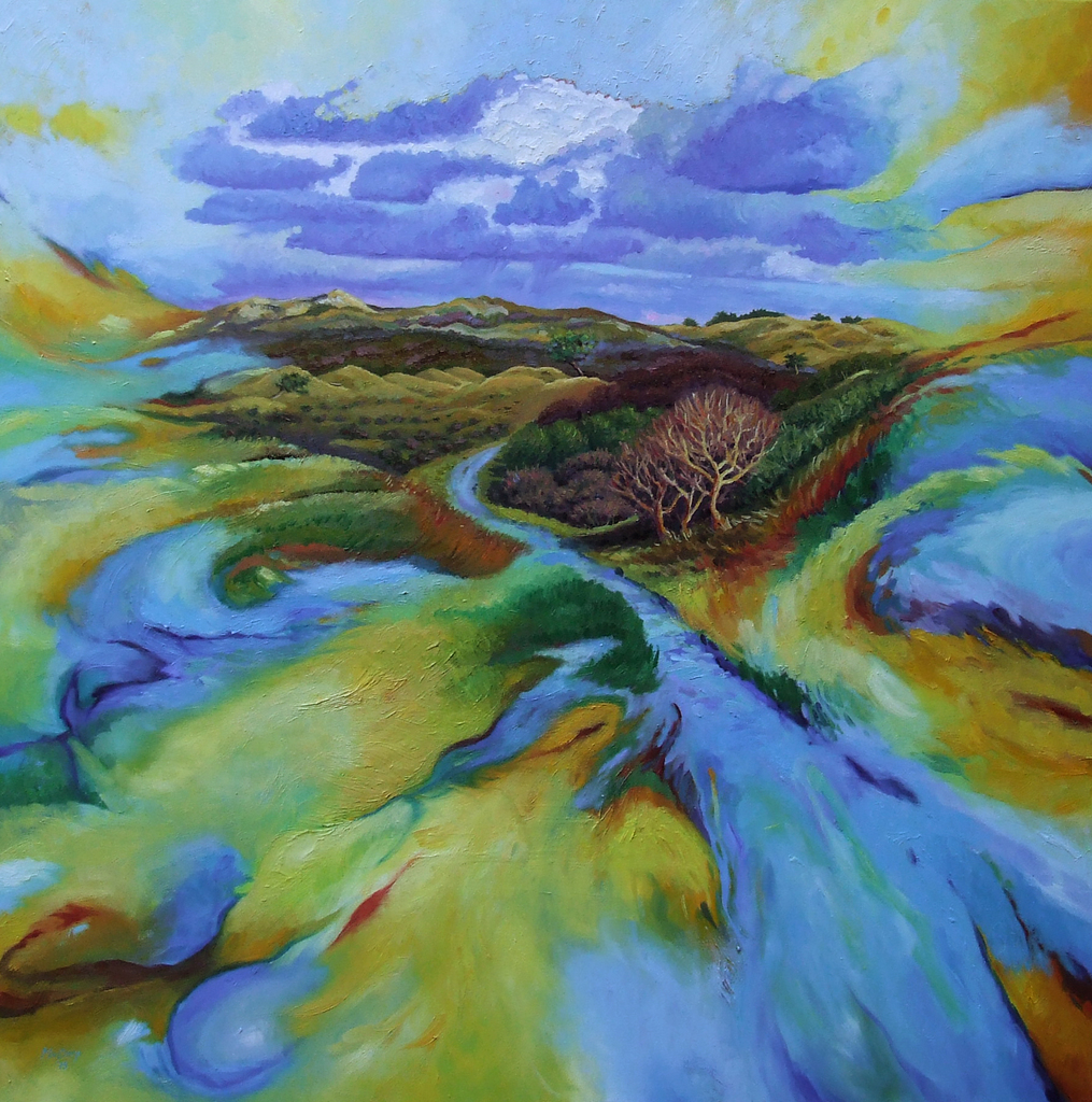 Duinen bij Bergen aan Zee.De realistische, duidelijk herkenbare landschapselementen, verliezen langzaam hun vaste vorm, veranderen in beweging, in ervaren, net als het voelen van het landschap in ons lichaam.