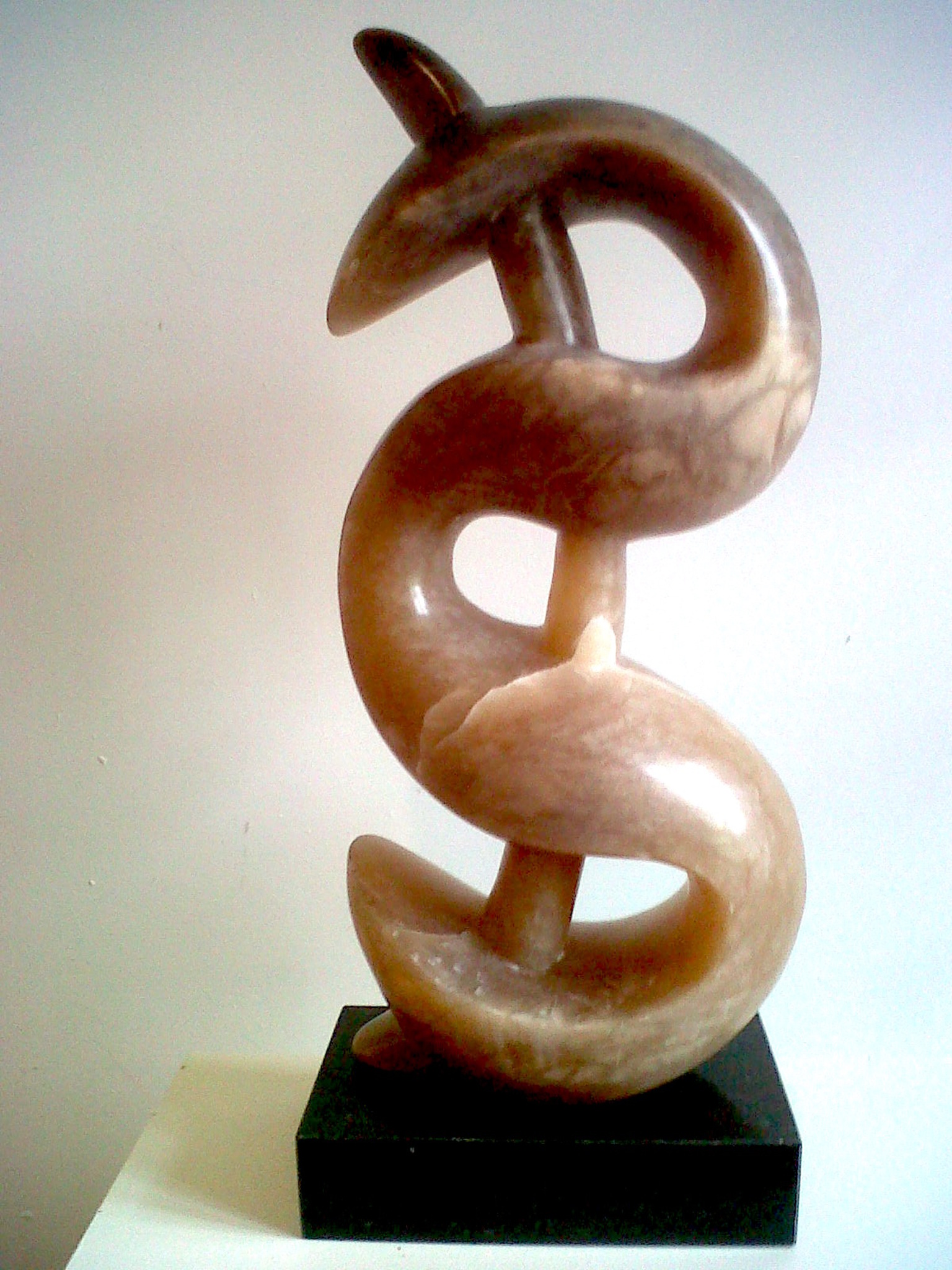 Abstract beeld van albast, in de kleur bruin/caramel. Het beeld is geplaatst op een zwarte, hardstenen sokkel