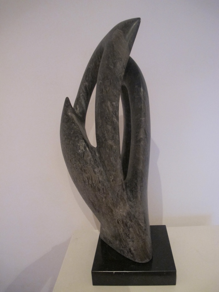 Abstract beeld van albast, in de kleur zwart/grijs. Het beeld is geplaatst op een zwarte, hardstenen sokkel