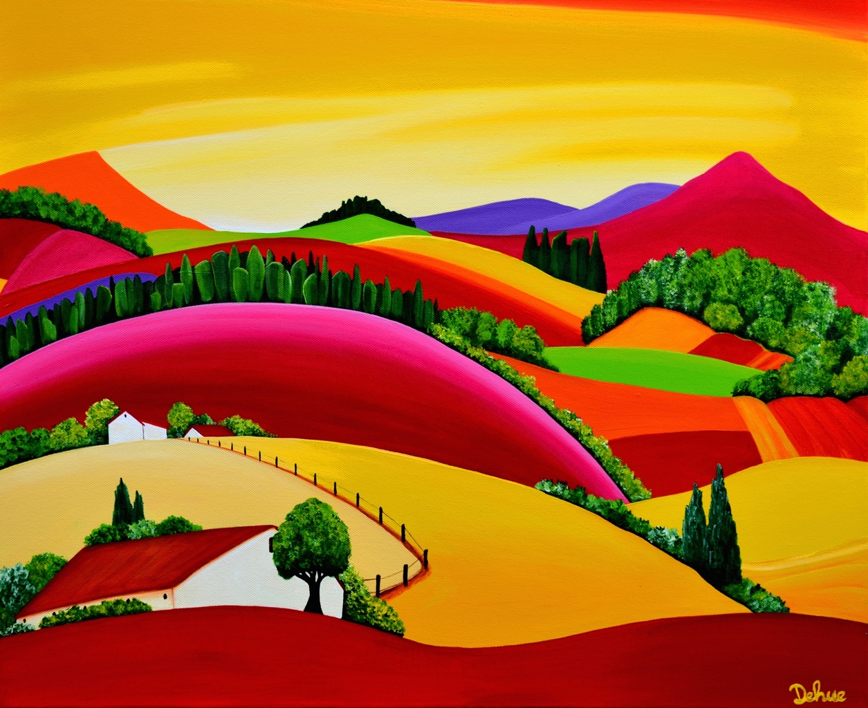 Huis Figuratief Modern Rood Oranje Geel Landschap Acryl Paars Groen Kleurrijk Frankrijk Bourgogne Bomen Abstraherend Roze Landscape Kleur Boerderij Frans Huisje Heuvels Colorful France Franse