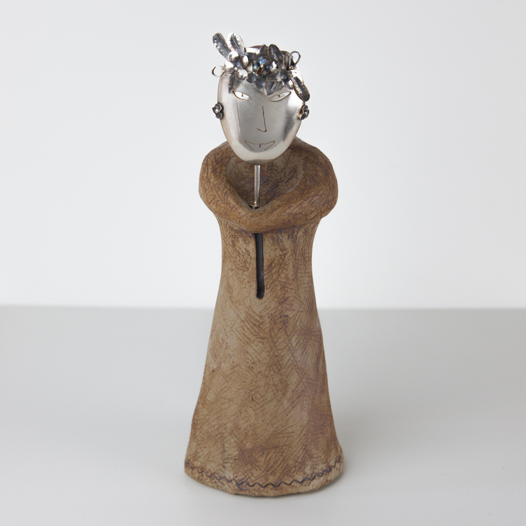 primavera (speld, zilver): 4 x 6 cm; beeldje (steengoed, ingewassen met ijzeroxide) : 21 x 7,5 cm