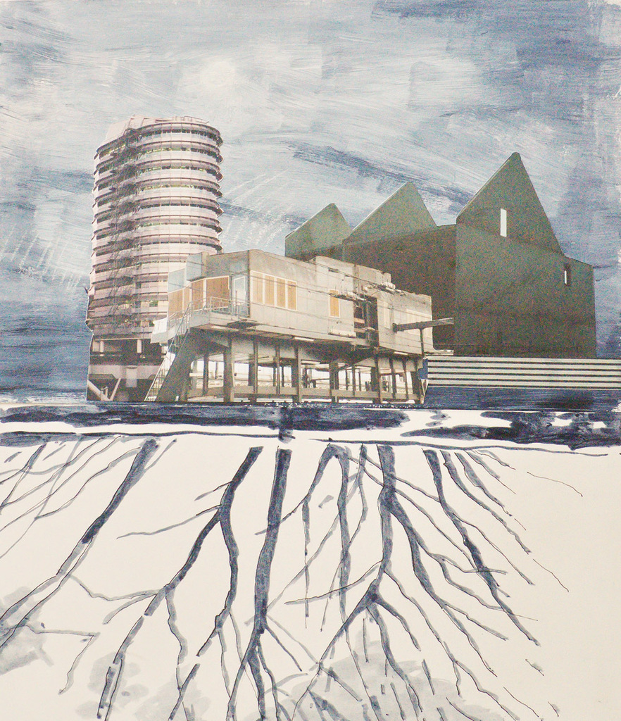 Stadslandschap is een samengesteld werk, gemaakt van foto-onderdelen en gebruik gemaakt van geschilderde achtergrond en getekende onderzijde.