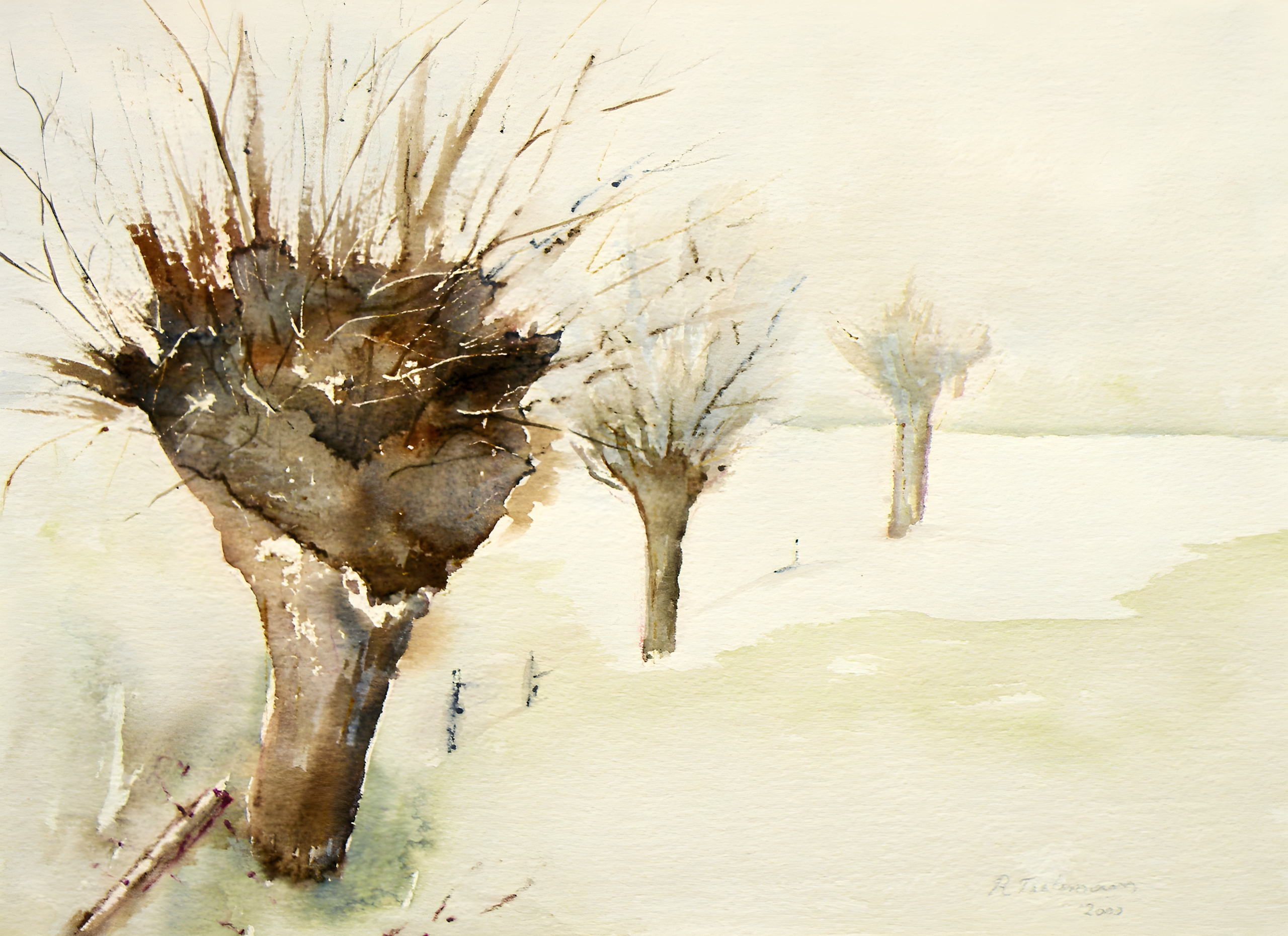 Kunstprinten van dit werk zijn ook verkrijgbaar op canvas, aluminium, plexiglas: https://www.werkaandemuur.nl/nl/shopwerk/Knotwilg/1691083 Het aquarel toont een verstilde scène van knotwilgen in een open landschap. De bomen, getekend met een losse, impressionistische toets, domineren het beeld met hun knoestige, verweerde stammen en grillige takken. De kunstenaar heeft de essentie van het winterse landschap gevangen, waarbij de kleuren gedempt zijn en de vormen suggereren meer dan ze definiëren. De voorste boom, prominent aanwezig, toont een rijkdom aan details in de bast en de afgesneden takken, wat een gevoel van leeftijd en veerkracht oproept. De achterliggende bomen vervagen in de verte, waardoor een gevoel van diepte en atmosfeer ontstaat. De zachte, lichtgroene tint van de grond contrasteert subtiel met de warme bruintinten van de bomen. Het hele werk straalt een ingetogen schoonheid en een poëtische reflectie uit van de natuur in haar meest pure vorm. Het is alsof de tijd zelf is stil komen te staan in dit moment van contemplatie.
