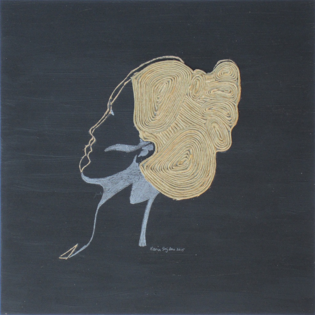 Portret van een dame met opgestoken haar. Gemaakt van MDF, touw en grafiet. De MDF is beschilderd en ingesneden. Kleuren, zwart, grijs en bruin.