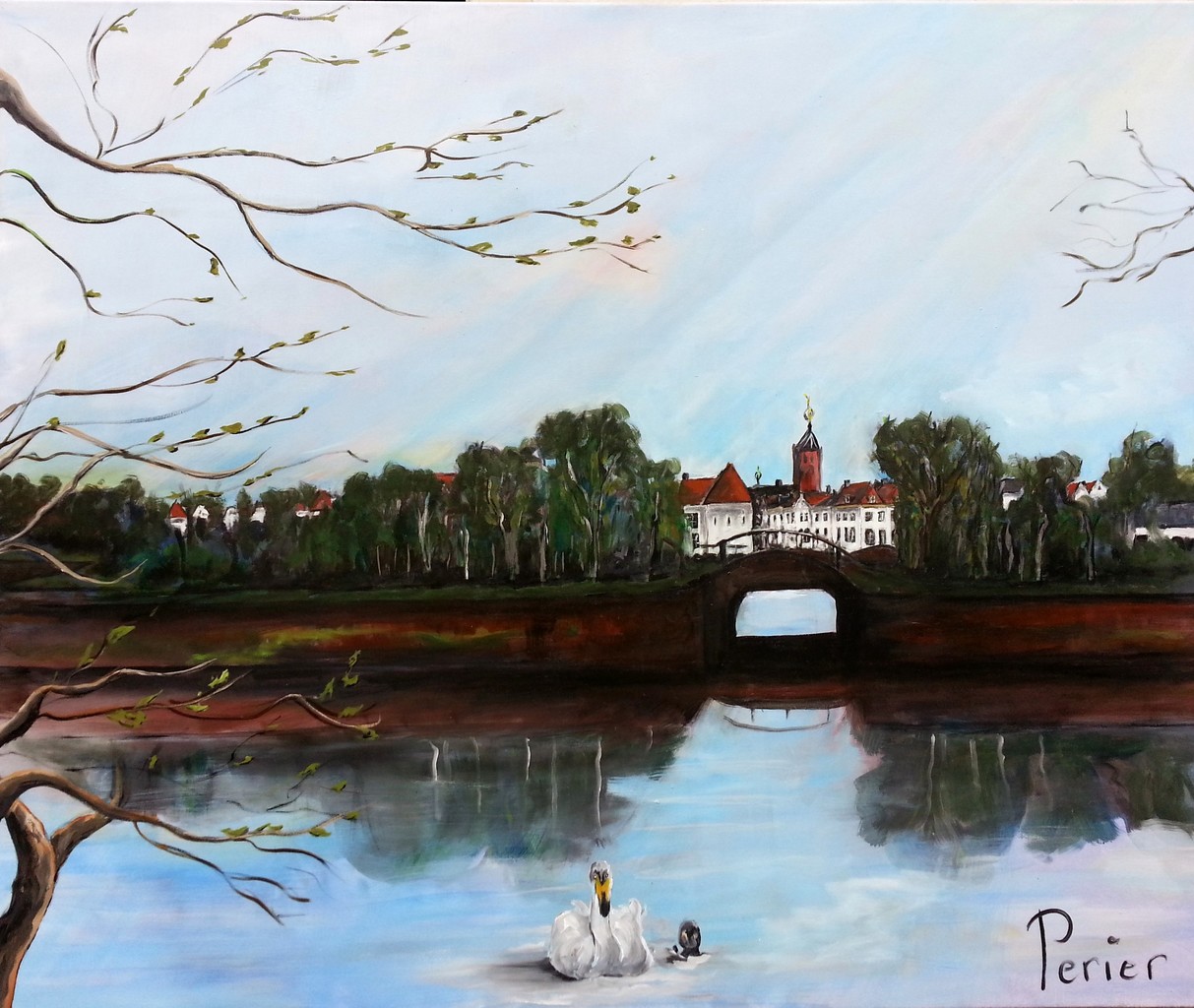 Impressie van Naarden met vanaf buitenring zicht op de vestingwal en daarachter de Marktstraat. De zwitte zwaan symboliseert de schoonheid, het zwartje toch de kanonnen