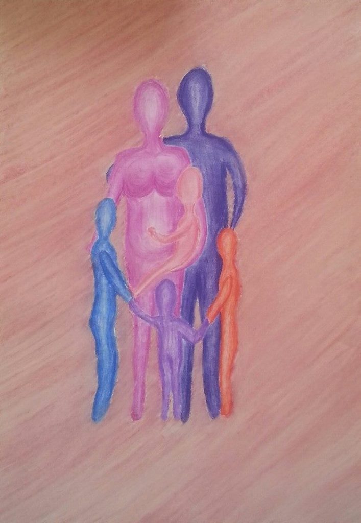 Opdracht: Abstracte tekening van de familie. Ieder gezinslid heeft een eigen kleur.