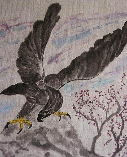 het tafereel is op chinees rijstpapier geschilderd in de vrije stijl.