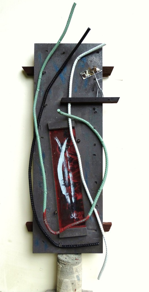 "toen onschuld een gotspe werd / hakte ik het aan / barrels en stukken. // Maar als de legendarische Phoenix / verrees het beeld / met als verder doel / alle vredelievende burgers / te wapen te roepen." (Noot: Onschuld, installatie, uit juli 2014, uiteen gehaald in 2015, delen hergebruikt in assemblage: hout, foto, ijzer, glas, verf, as)