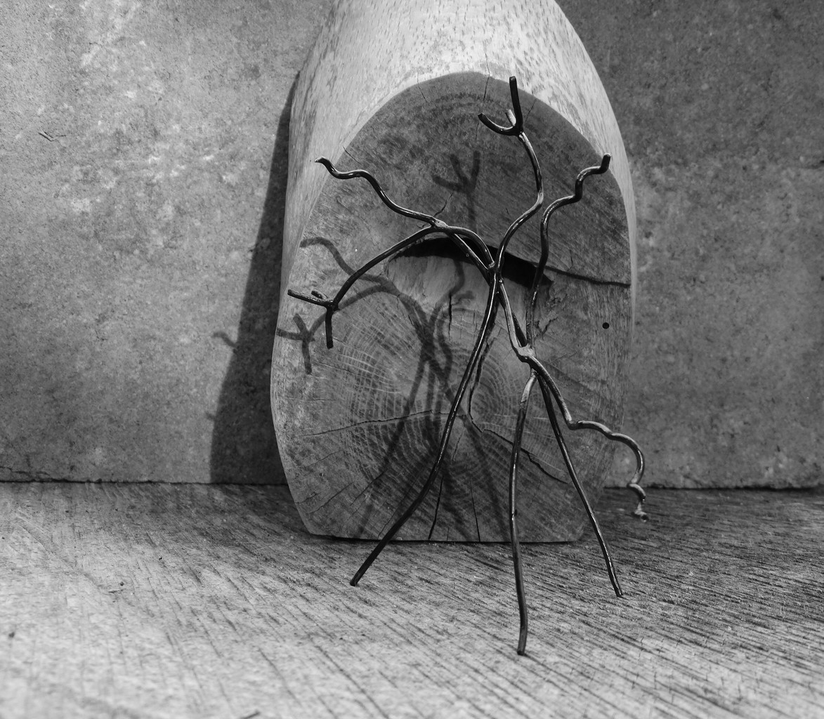 In ernst: deze draad-sculptuur / heeft geen geweten / noch bewustzijn / en werd door de artiest / geplaatst als wachtpost / om het hout te weerhouden / van beweging weg / van de steen / op de achtergrond. (Stijl: tijdelijke sculptuur. Koper figuur gemaakt door DM, geplaatst om assemblage te vormen met hout en steen op boomstam)