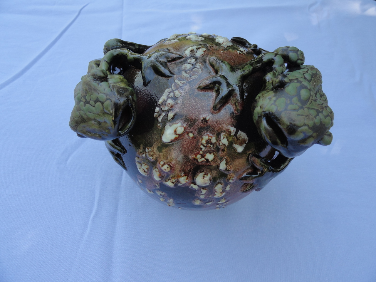 Twee kikkers die nieuwsgierig naar elkaar kijken op een bol. De kikkers zijn handgevormd en geglazuurd met groene terugtrekkende glazuur waardoor de zgn. krokodillen huid is ontstaan. De bol is geglazuurd met avonturijn glazuur wat een mooi glinsterend effect sorteert. Gestookt op 1060 graden.