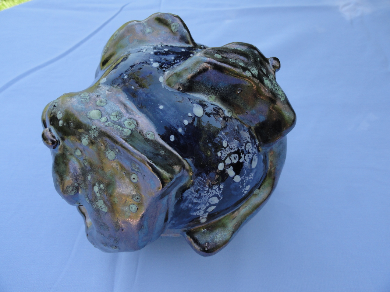 Drie dolfijnen op een blauwe bol. Handgevormd en geglazuurd met zilverachtige glazuur met witte terugtrekkende glazuur hetgeen een appart effect sorteert. De bol is geglazuurd met donker blauw aardewerkglazuur en geaksentueerd met witte spatten. Gestookt op 1060 graden.