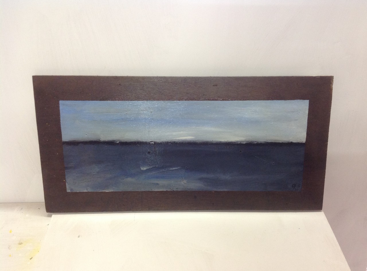 Verrassend zeewerk op houtpaneel, natuurlijk gevonden op het strand van Texel. 25 x 65 x 2 cm. VERKOCHT.