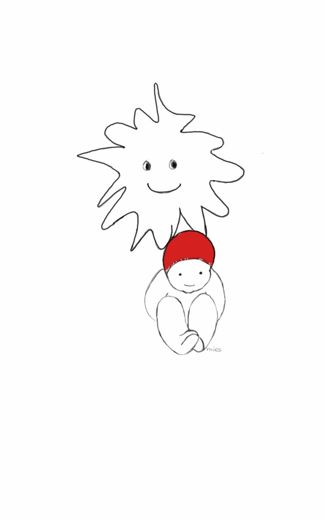 Kleine eenvoudige tekening van baby met mutsje en zon