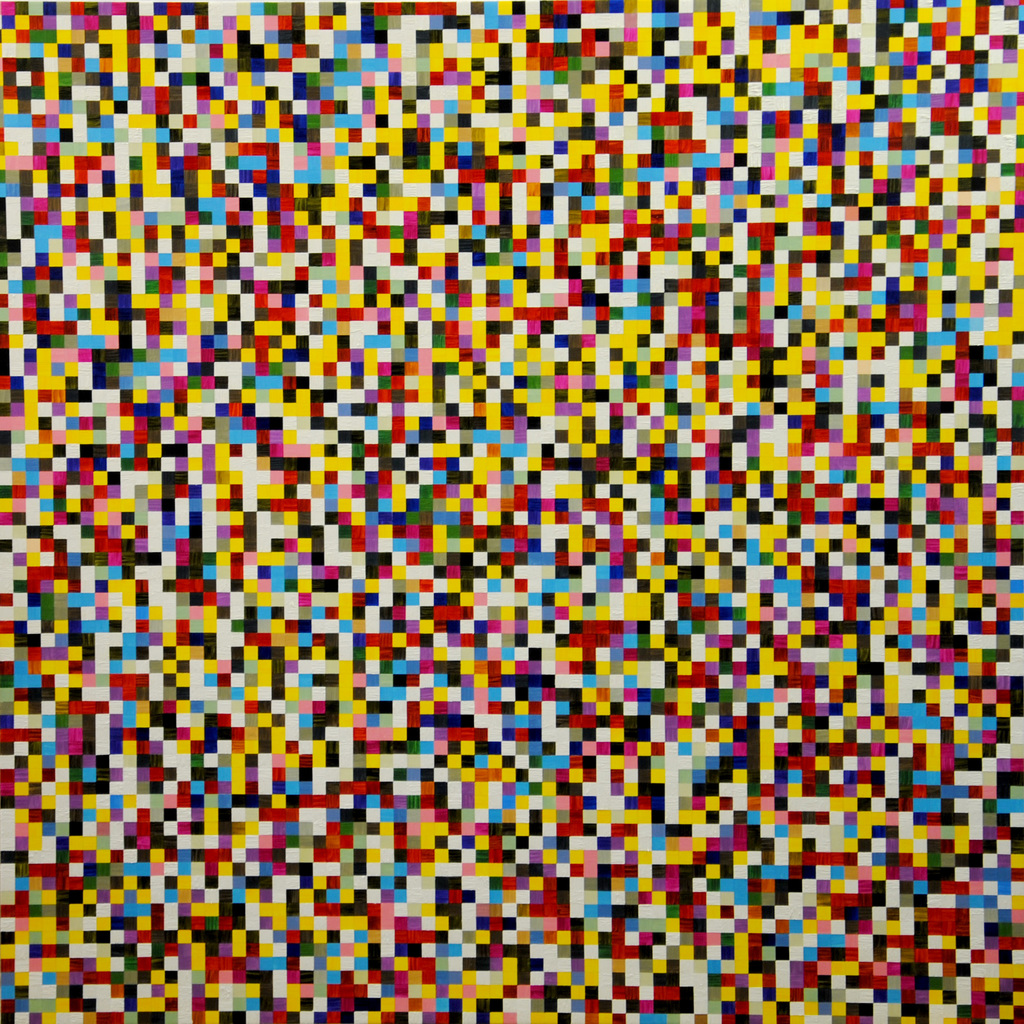 Thema: Chaos (Geometrische Chaos) Mijn kunst is beïnvloedt door de moderne wiskundige en wetenschappelijke benadering van het begrip complexe orde van de natuur. Met name heb ik me verdiept in de Chaos theorie en de fractal geometrie. Ik ben geen wiskundige, en ik gebruik geen wiskundige formules. De ideeën van de Chaos theorie en fractal geometrie leiden tot de ontwikkeling van de composities in mijn werk. Ik gebruik driehoeken,vierkanten en cirkels in mijn schilderijen, maar in mijn huidige serie, geoChao richt ik me alleen op de vierkanten en de verhoudingen tussen de vierkanten. Ik ontwikkel mijn composities door kleine vierkantjes op grote te zetten of grote op kleine te zetten. Het gaat om de onderlinge verhoudingen tussen de vierkanten. Ik laat de methode die ik kies de compositi