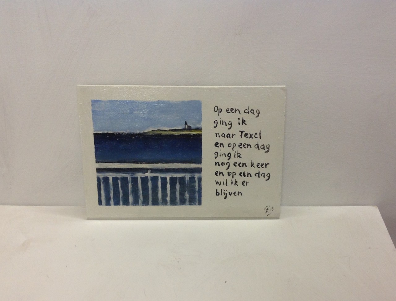 Kunstkaart op hout 20 x 30 x 2 cm. Handgeschilderd en handgepenseeld. Combinatie van woord en beeld. VERKOCHT.