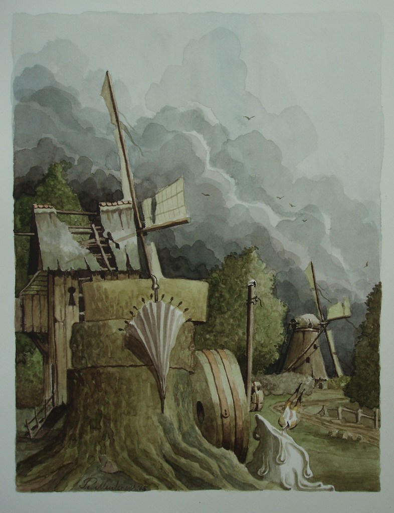 Molensteen Windmolen Kaars Boom Landschap Natuur Wolken Paraplui Papier Aquarel Realisme Romantiek Fantasie