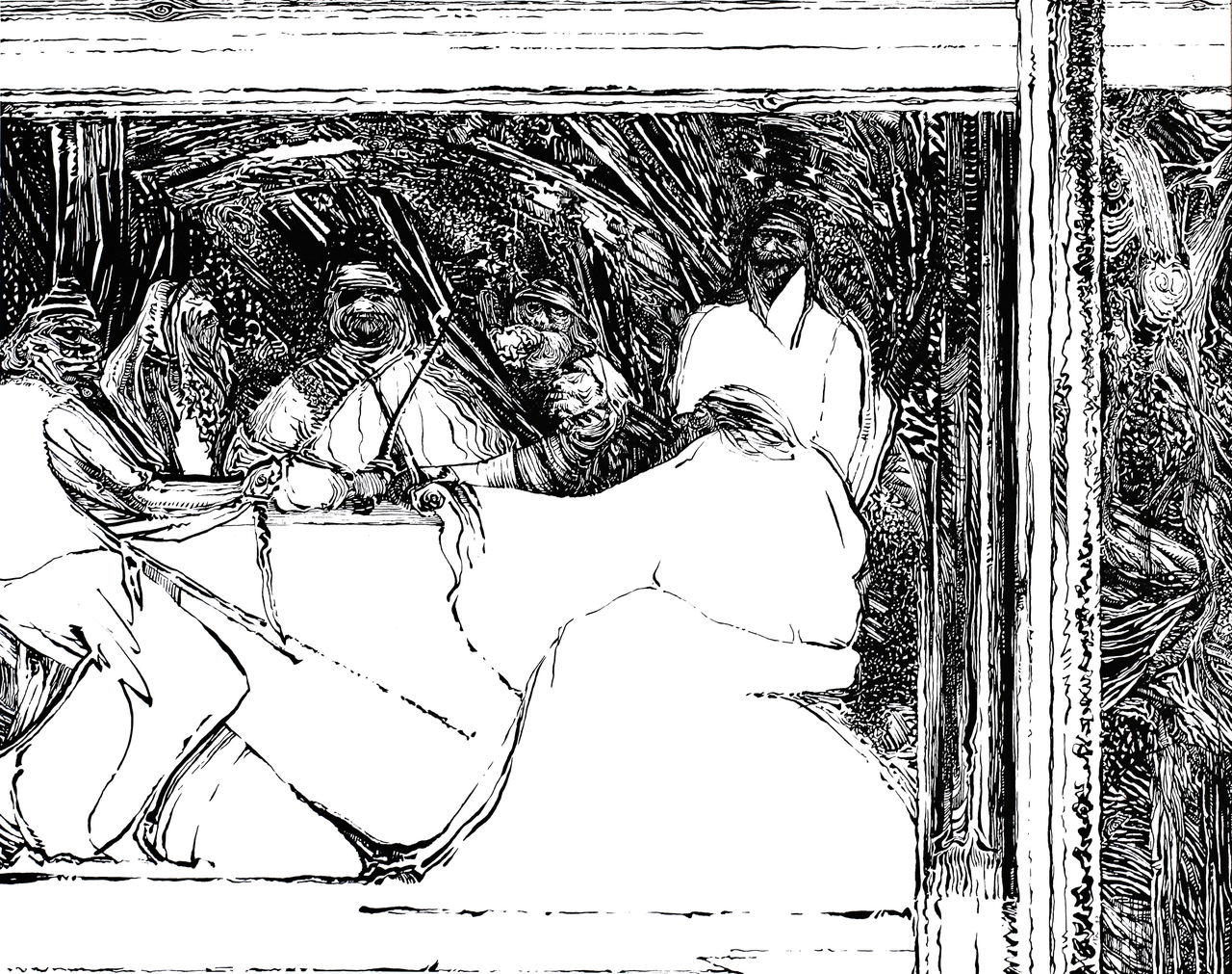 Een zwart-wit interpretatie van een schilderij van Rembrandt