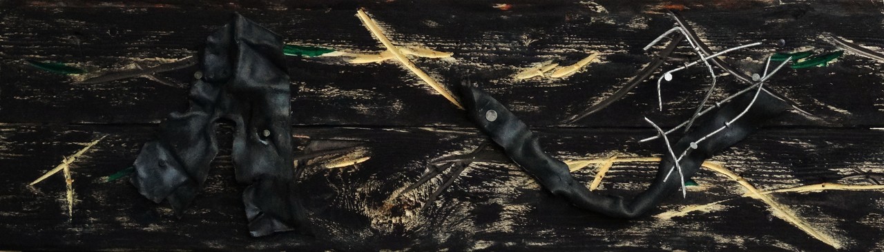 Geen kale wortels: Er is geen groei / zonder wortels / en weerstand bereikt z'n doel / alleen indien radicaal. // Maar, blootlegging / vormt een gevaar / en dat maakt / dat ik undercover ga. (assemblage, ijzer, lood, hout, verf.)