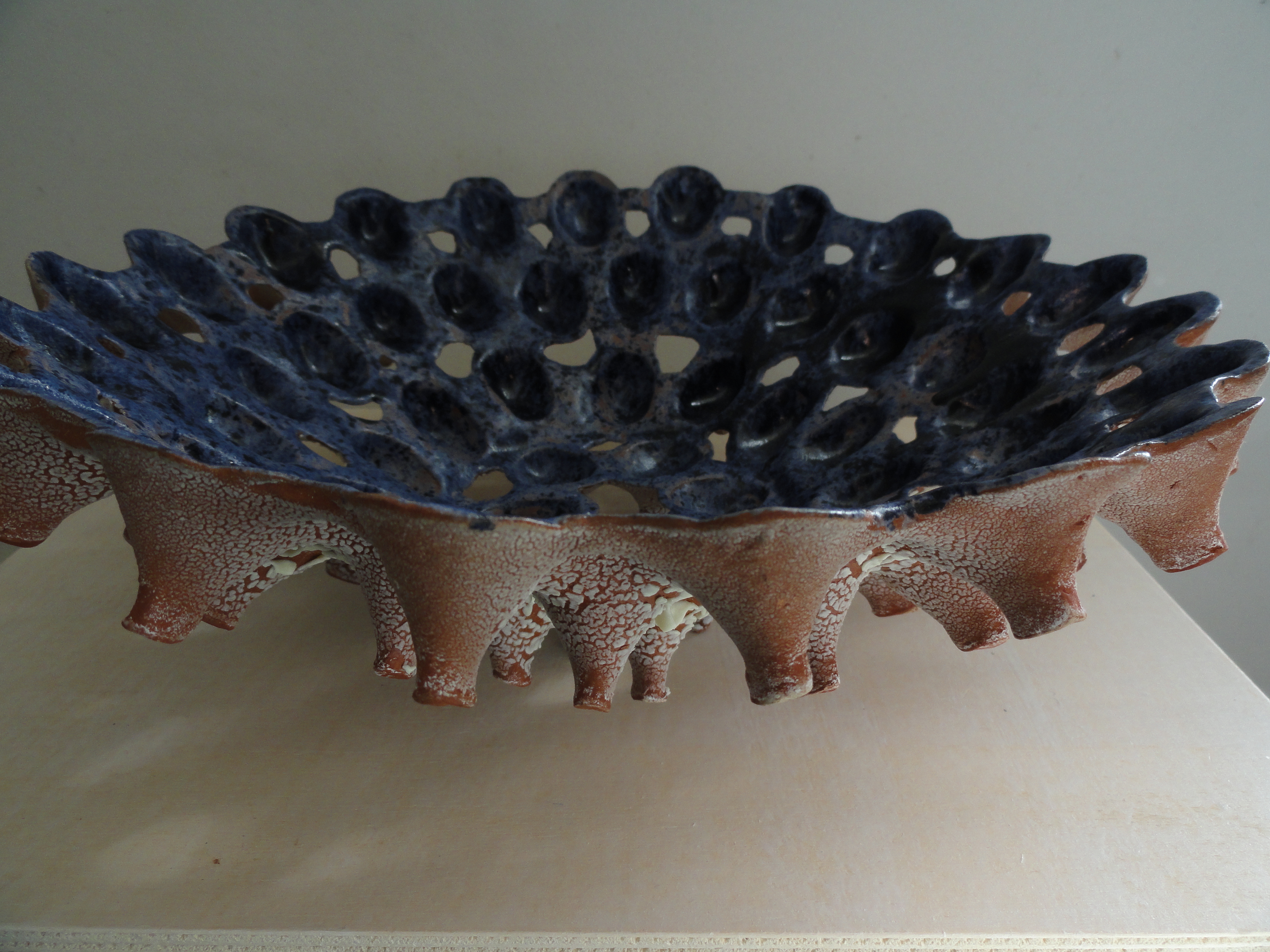handgevormde schaal uit rode klei van tientalen kuipjes die aan elkaar gemonteerd zijn . De schaal is aan de binnenkant afgewerkt met blauw satijn/matglanzend glazuur waarop kobalt korreltjes gestrooid zijn. Buitenkant is gespoten met wit terugtrekkend glazuur. De effecten zijn fascinerend. Alles is gebakken op 1100 graden