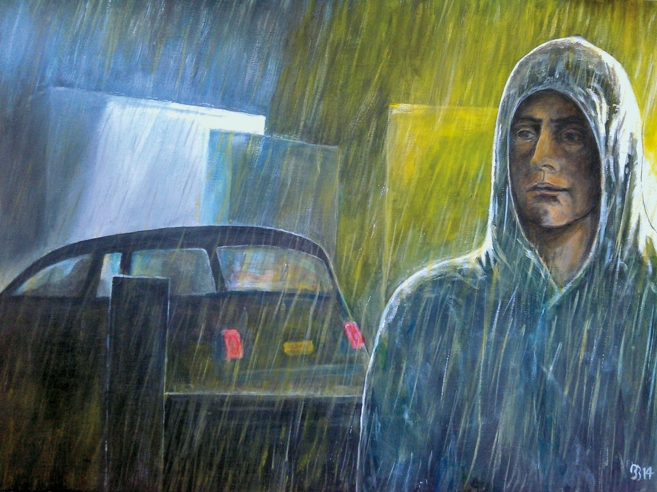 Man staat in de regen