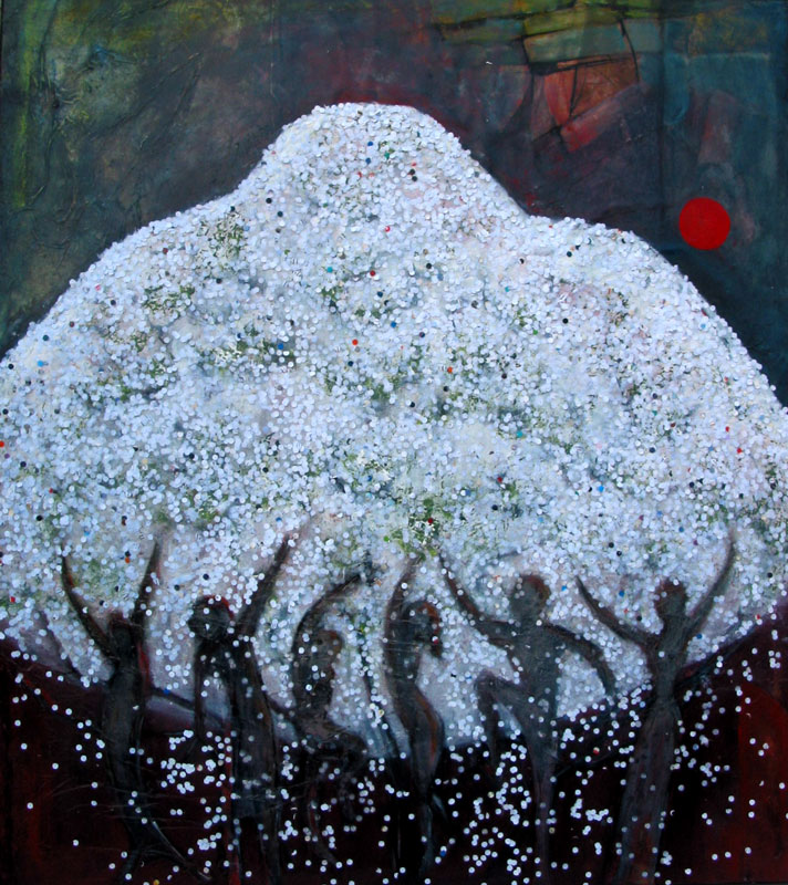 Feestvieren in je dorp rond de kersenbloesemboom; de dichter durfde het vorig jaar niet aan. Ik heb een "vanitas"van dit thema gemaakt; de kersenbloesems vallen als sneeuw uit de boom, over de dansende figuren. Zo worden de kersenbloesems symbool voor de tijdelijkheid van alles.