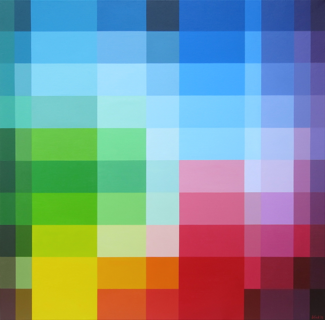 Geometrische compositie met verschillende kleuren. De zijkanten van het doek (katoen) zijn ook beschilderd.