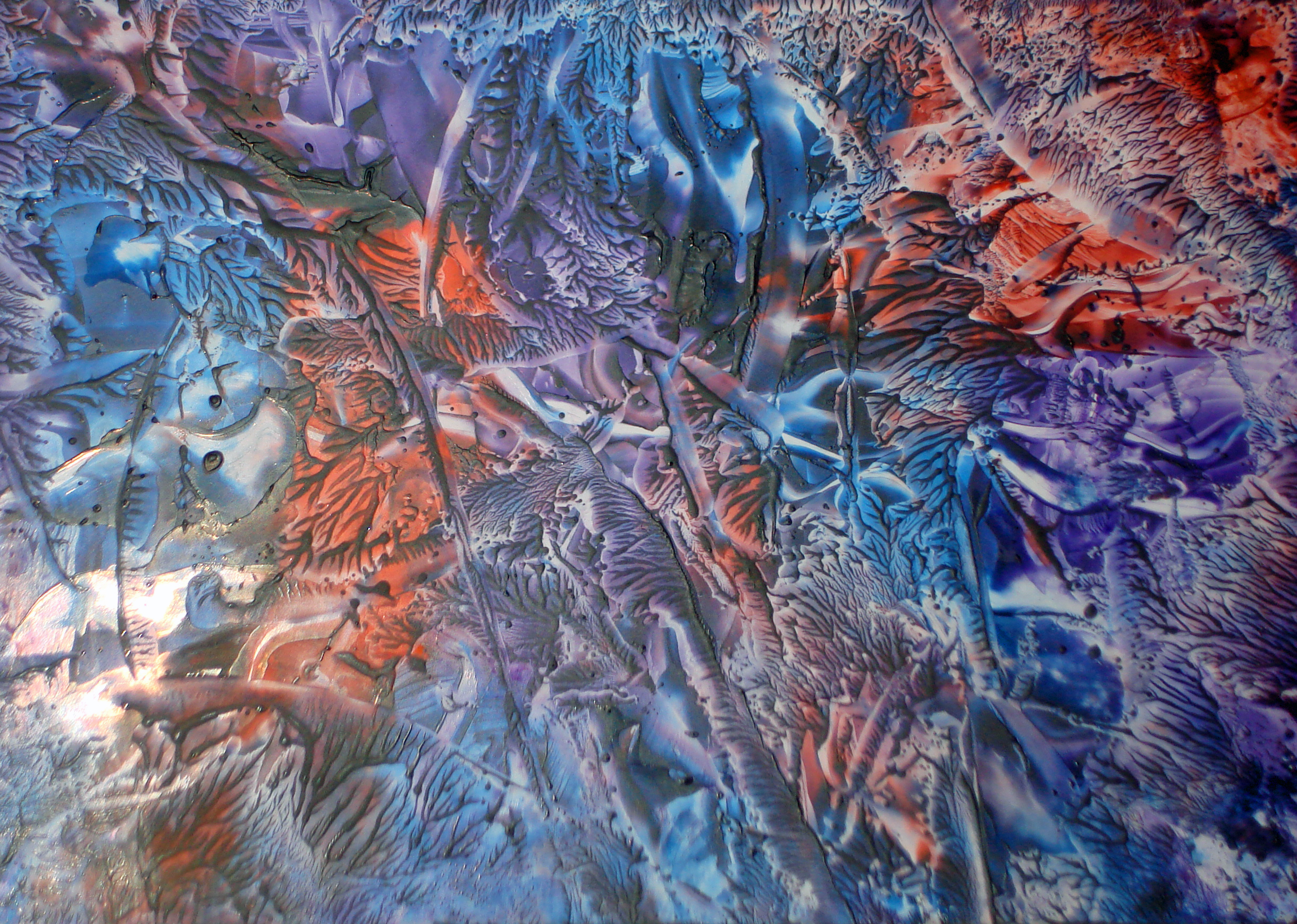 Zeer kleurrijke wildernis. Veel komende kleuren die tergkomen zijn blauw en rood, paars en zilvertinten.