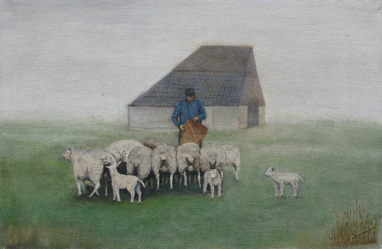Een van mijn eerste werkjes. Een Texelse boer die zijn schapen voert bij mistig weer.