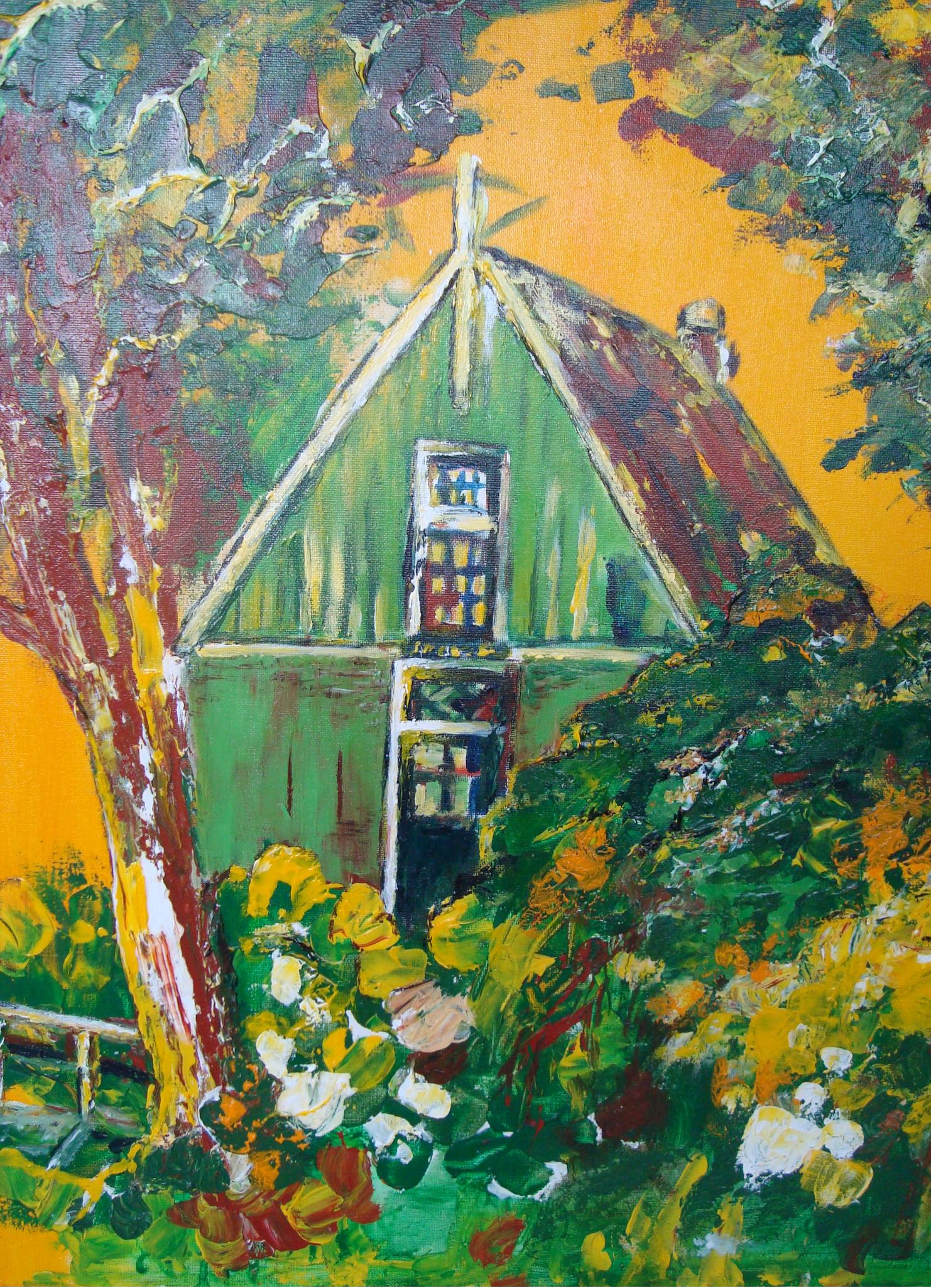 "Moeders erf ", gemaakt tijdens de jaarlijkse schilderdag in Twisk. Paletmessen en het kleurgebruik geven het geheel 'n andere dimentie. Met blank houten baklijst.