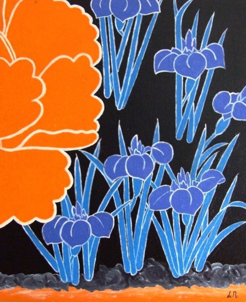 Olieverfschilderij. Zomer 2007 Dit moderne en grafische schilderij valt op door zijn krachtige kleurcontrasten en strakke lijnen. Linksboven domineert een grote feloranje bloem, omlijnd met een lichte contour. Aan de rechterzijde groeien elegante paarse bloemen met blauwe stelen en bladeren – vermoedelijk irissen – vanuit een donkere, zwartkleurige achtergrond. De heldere kleuren en vlakke kleurvlakken geven het werk een bijna abstracte uitstraling. De compositie is evenwichtig en opvallend, en roept een gevoel van zowel energie als rust op door de zorgvuldige plaatsing van vormen en kleuren.