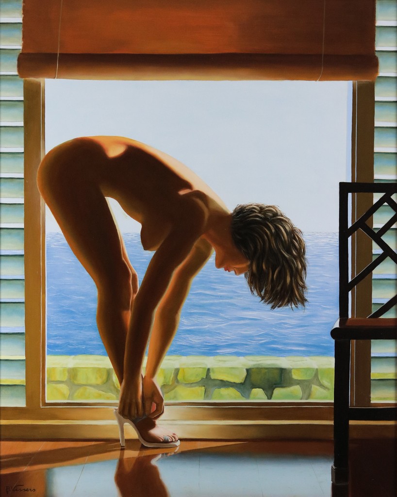 Schilderij Zee Zon Vrouw Naakt Woman Realistisch Painting Schoenen Raam Vissers Realistic Naked Shoe Bert Bertvissers