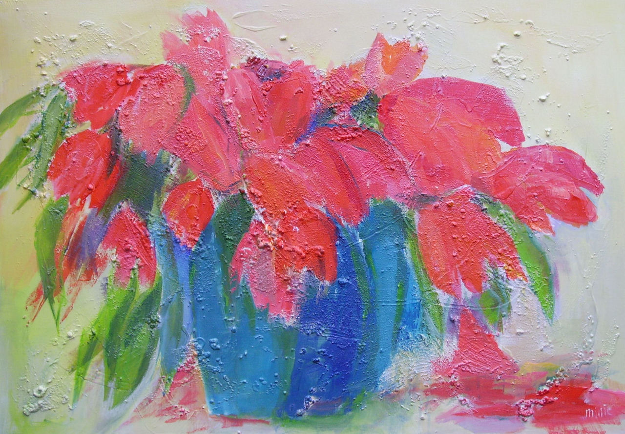 Suggestie van rode bloemen. Opgezet met paletmes.