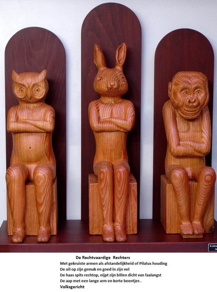 Uil Aap Dikbuik Larix Lariks Rechters Rechtvaardig Haas Afstandelijk Voetsteun Houtsculptuur Rechtbank Parodie Wetteren