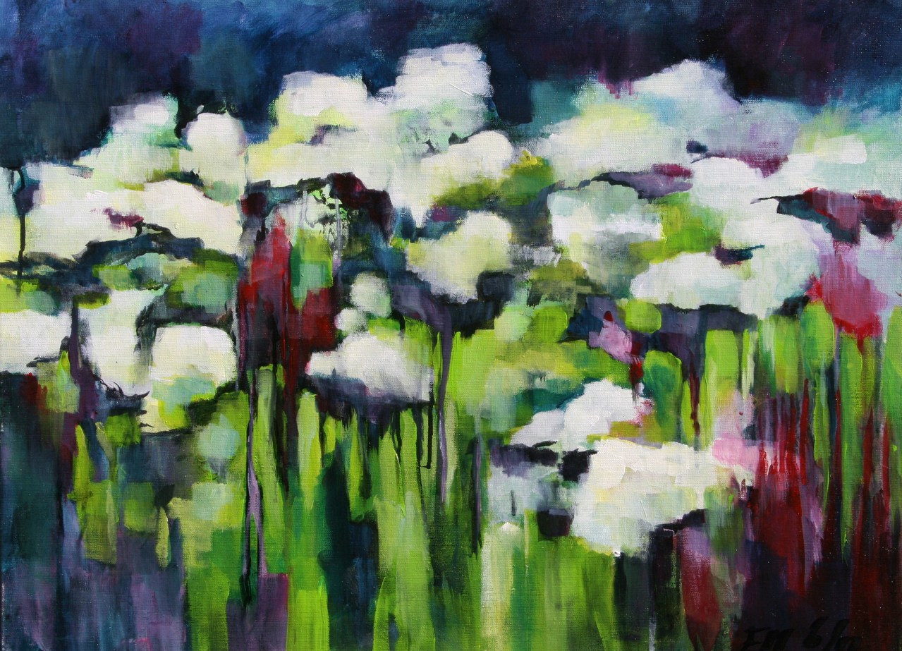 Verkocht In Boekel met een grote groep ergens aan de rand van het dorp (Puttershoek). Mijn inspiratie was een slootrand met prachtige witte schermbloemen en rode zuring. 3D doek, zonder lijst