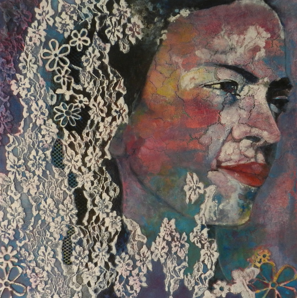 Portret van Frida Kahlo, techniek Acryl mixed media op canvas.