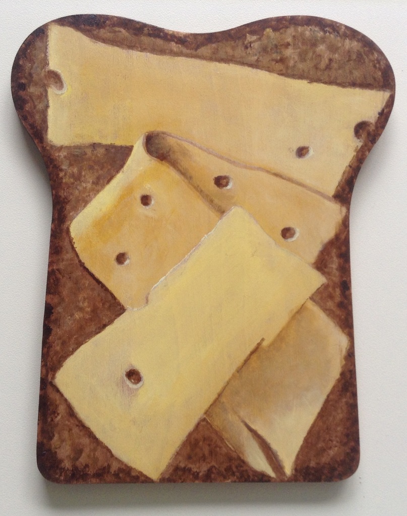 Op een houten kaasplankje in de vorm van een boterham heb ik een boterham met kaas geschilderd.