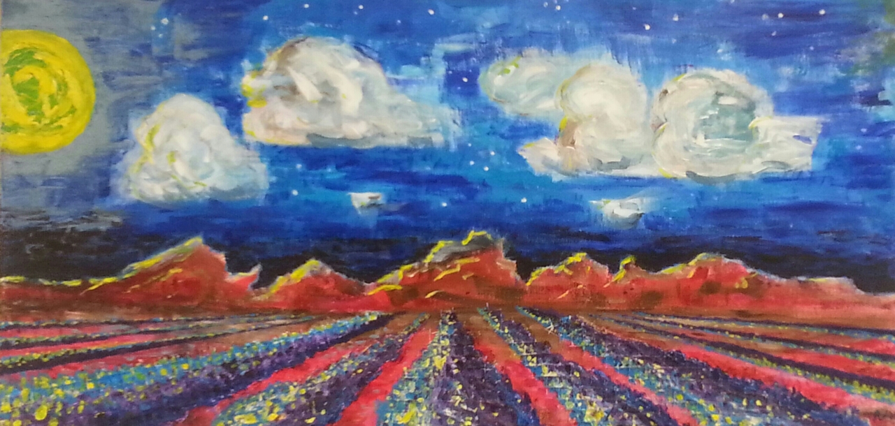 De bollenvelden achter de duinen bij avondlicht. In het schilderij is kippengaas verwerkt.