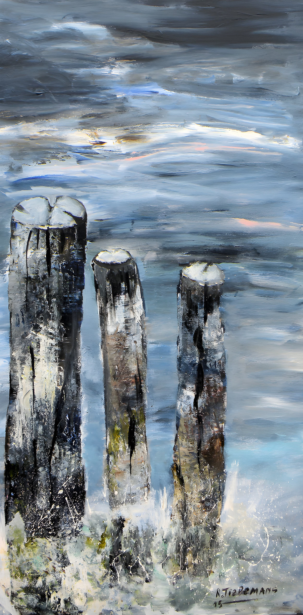 Kunstprinten van dit werk zijn ook verkrijgbaar op canvas, aluminium, plexiglas, posterpapier: https://www.werkaandemuur.nl/nl/shopwerk/Strandpalen/171440 Dit schilderij roept een gevoel van kalme maar melancholische introspectie op, met zijn gedempte kleurenpalet en gestructureerde penseelstreken. De drie verweerde houten palen, die standvastig staan te midden van een wervelende, bijna abstracte afbeelding van water en lucht, suggereren thema's van veerkracht en het verstrijken van de tijd. Het gebruik van koele blauwtinten, grijstinten en wit door de kunstenaar creëert een rustige maar sombere sfeer, terwijl de ruwe textuur op de palen diepte en realisme toevoegt. De compositie is eenvoudig maar krachtig, met de verticale lijnen van de palen die contrasteren met de vloeiende achtergrond. Deze tegenstelling zou stabiliteit kunnen symboliseren in het aangezicht van de onzekerheden van het leven of de blijvende aanwezigheid van de natuur tegen de menselijke kwetsbaarheid. Het subtiele samenspel van licht en schaduw versterkt de humeurigheid van de scène en nodigt kijkers uit om na te denken over eenzaamheid, herinnering of de schoonheid die te vinden is in verval. Over het geheel genomen legt dit stuk een aangrijpend moment vast, waarbij abstractie en realisme worden gemengd om emotie en bedachtzaamheid op te roepen.