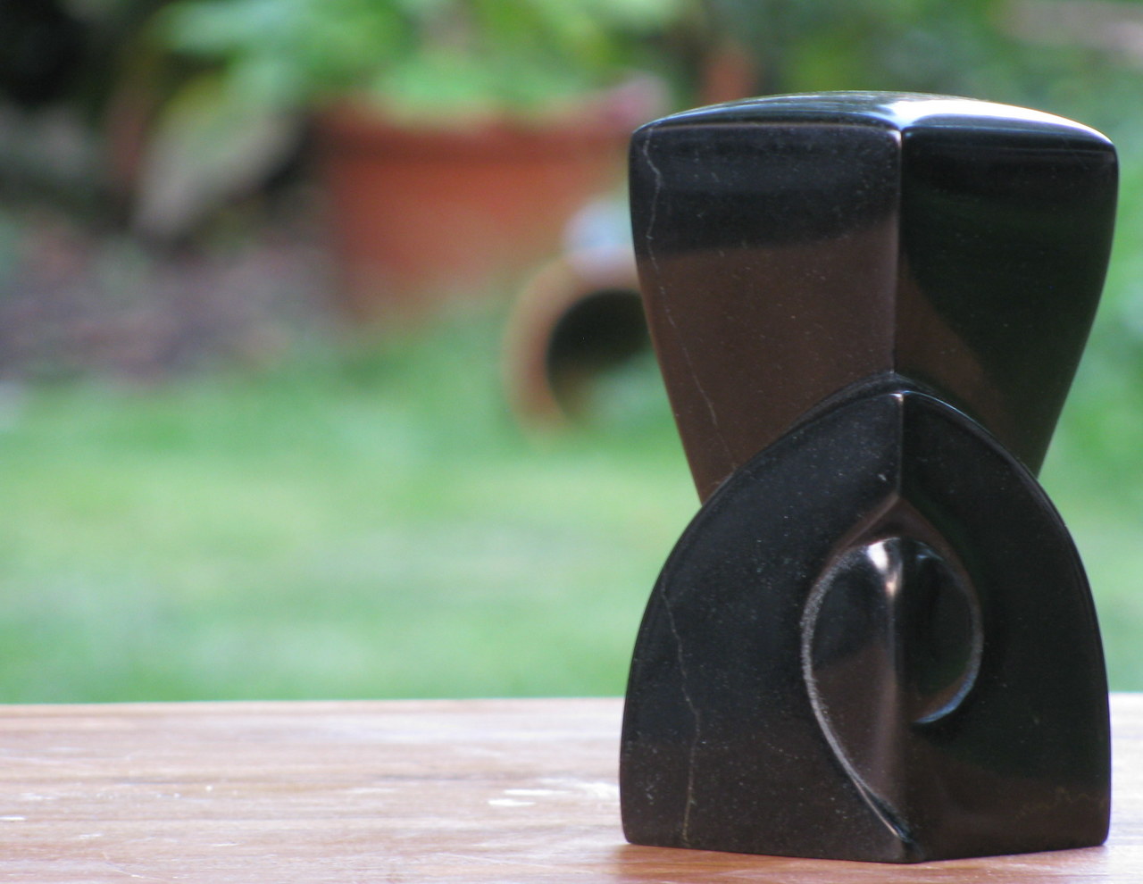 Figuur in een groot, overweldigend gebouw. Uitgevoerd in zwart groen Galastone (India).