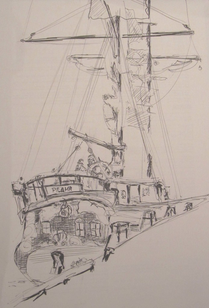 Tekening van het Tjechische schip La Grace afgemeerd aan de Halkade in IJmuiden