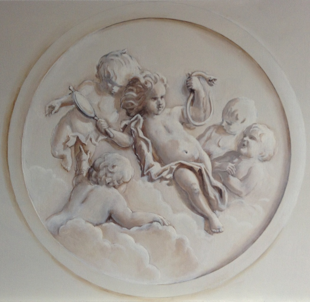 Dit soort Grisailles zitten vaak boven deuren, ze zijn o.a. te zien in het Frans Hals Museum in Haarlem en in het Paleis op de Dam in Amsterdam.