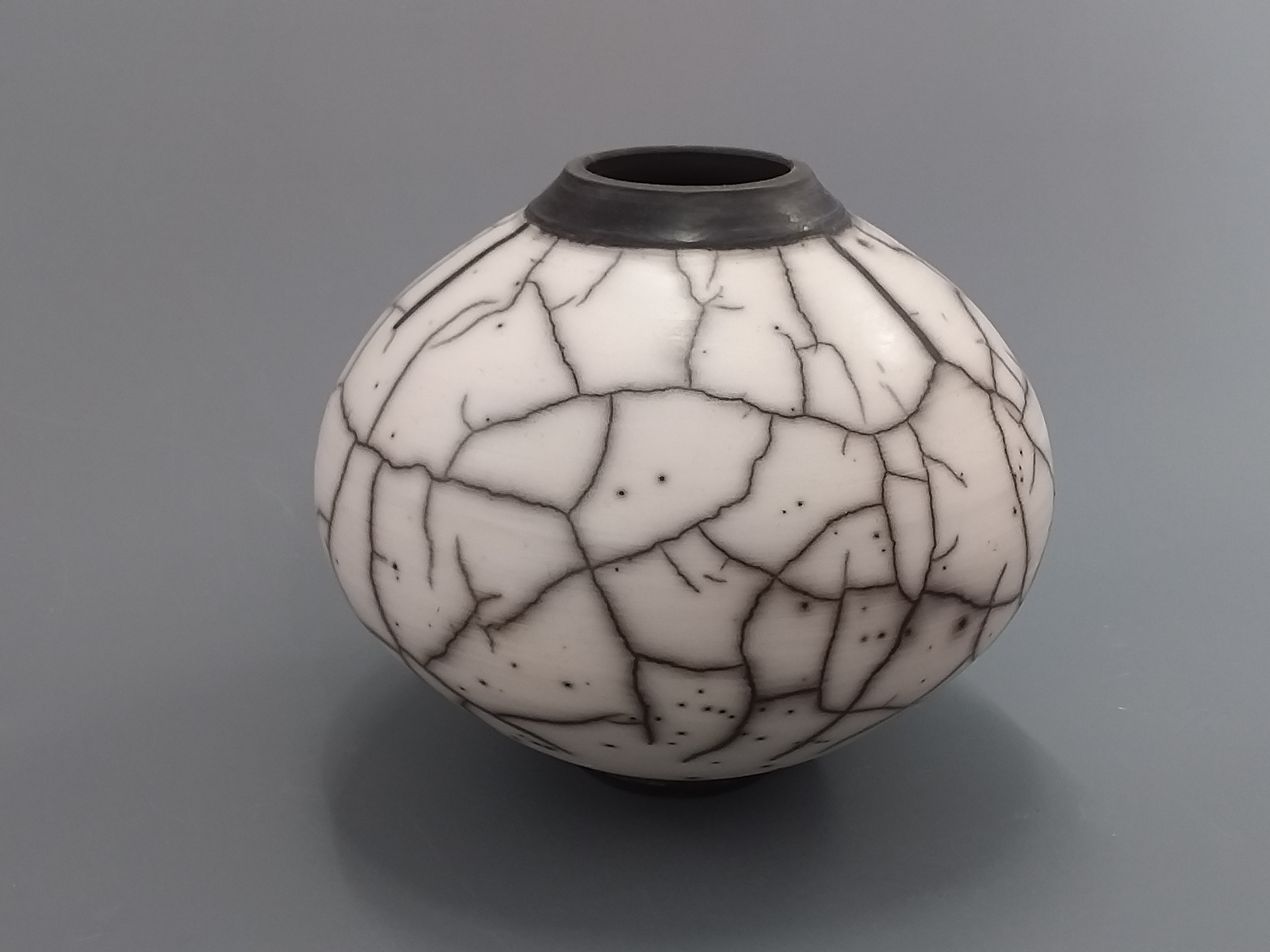Gedraaid/gepolijst en in de gasoven op 800 c gestookt.In zaagsel gesmoord en gerookt.